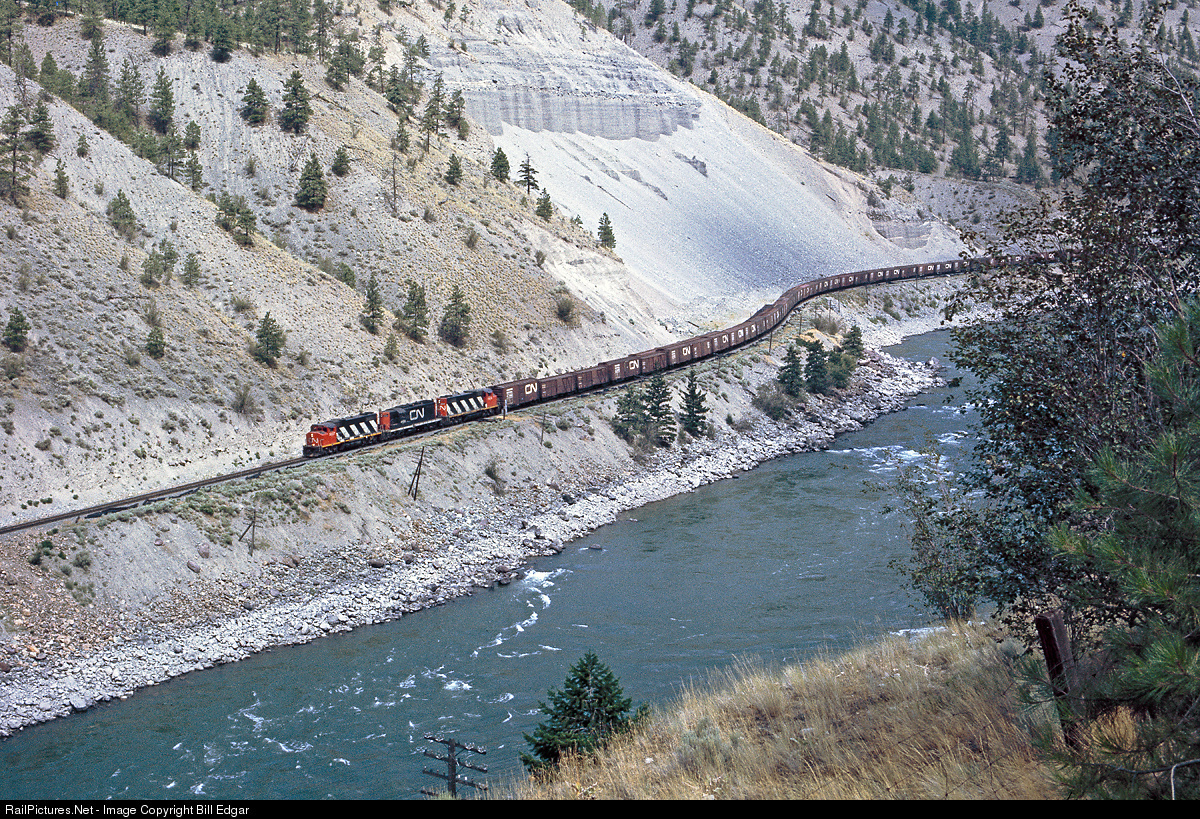 | A GP38-2W/GP9/GP38-2W consist led by CN 5607 rolls west through a slide area with a train of grain box cars headed for Vancouver, BC. This location is along the Thompson River across from Skihist Provincial Park and is known for slide problems. The train is nearing Lytton, BC where it will continue through the Fraser Canyon. |
