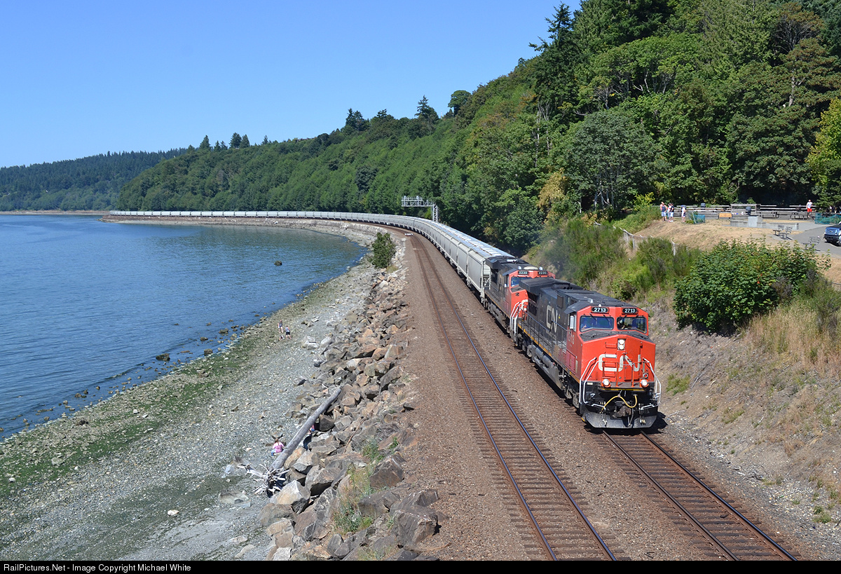 A CN grain train from Canada snakes its way down the coast of the Puget Sound on BNSF's Scenic Subdivision.