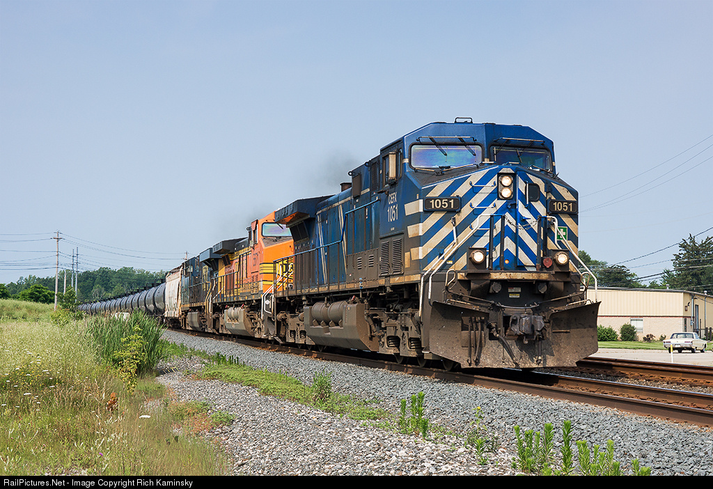 | Crude oil train CSX Q140 heads for South Philadelphia, Pa, with a rather rough looking CEFX "Bluebird" out front |