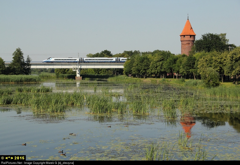 The Express Intercity Premium (EIP) is on the bridge over Nogat River and with a large speed is heading from Kraków Główny to Gdynia Główna. On the right is only a very small piece of the one of the lager castles of the German Crusaders built in 14th century.