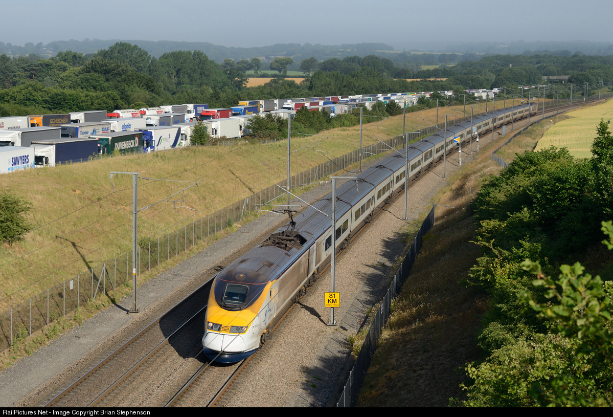 | Eurostar power car No 3216 leads the 07.02 St.Pancras International, London to Paris Nord service. In the background three lines of lorries (trucks) can be seen parked on the M20 Motorway blocking both carriageways while waiting to cross the English Channel to France. This is known as 'Operation Stack' which is brought in when there are heavy delays either in the Channel Tunnel or to ferries from Dover to Calais. This time it was striking seamen blockading the Port of Calais. |