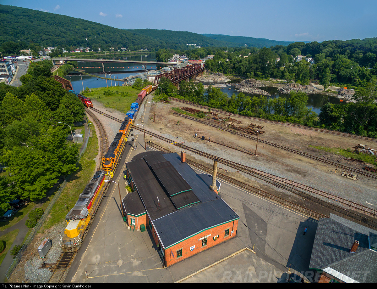 A late-running New England Central Railroad train #324-05 heads into Bellows Falls, Vermont, from North Walpole, New Hampshire with Connecticut Southern Railroad SD40-2 3771, NECR SD40T-2 3317 and NECR SD40-2 3405 leading CEFX AC4400CW 1016 and a 100-plus car train. The third through eleventh cars contain granite from the VRS Granite Division. Vermont Rail System GMRC Bellows Falls Switcher - DASW - is seen waiting to cross the diamond on the GMRC Bellows Falls Subdivision with CLP GP40-2 306 and GMTX GP38-2 2215. The storied diamond once saw the likes of trains from the Rutland, Central Vermont, and Boston & Maine.