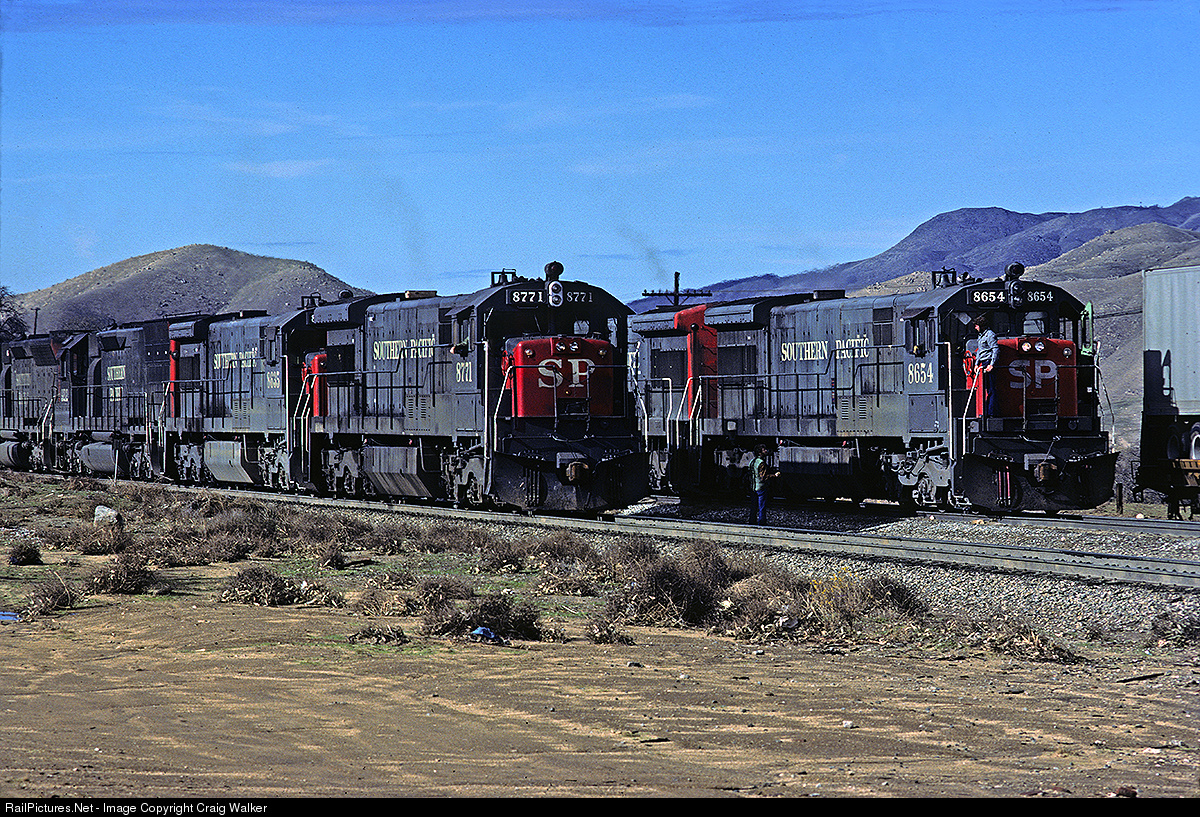 Improvised helpers on the Hill... As a Southern Pacific eastbound was climbing the Tehachapis on January 20th, 1978, it stalled out at Bealville. So, a westbound descending the hill was stopped, and U33Cs 8654 and 8606 were cut off an transferred to SP 8771 East to help it to the summit at Tehachapi, California. The train made an awfully nice sound as it assaulted the grade with three U33Cs, an SD45T-2 and an SD45 - even with one of the GEs not working!