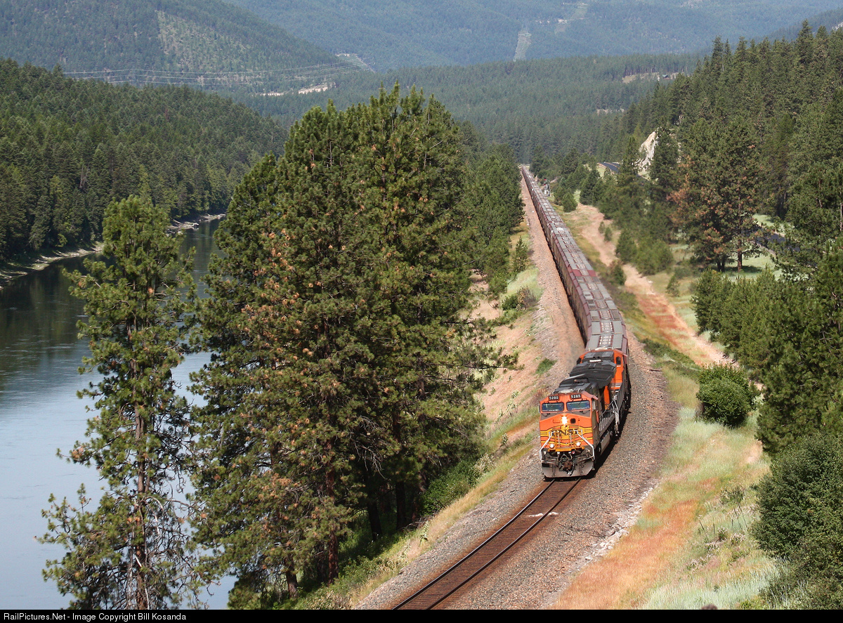 This BNSF grain train is moving west along the Clark Fork between St. Regis and Paradise on the MRL fourth subdivision.