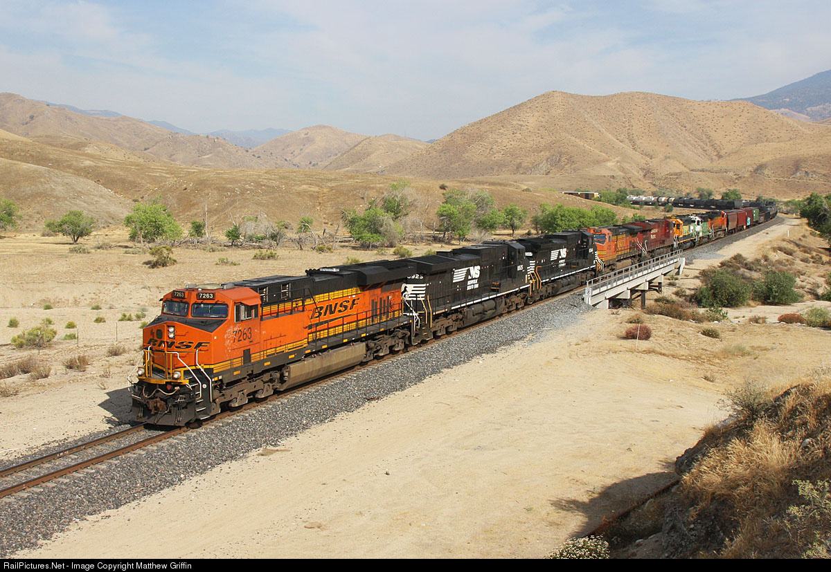 | Can't beat this train for variety. One of the reasons to frequent Tehachapi Pass is that most of the BNSF manifests usually have everything but the kitchen sink for power. You won't find this in Cajon Pass however, so take advantage and drive the 90 miles further and award yourself with something decent, right? |