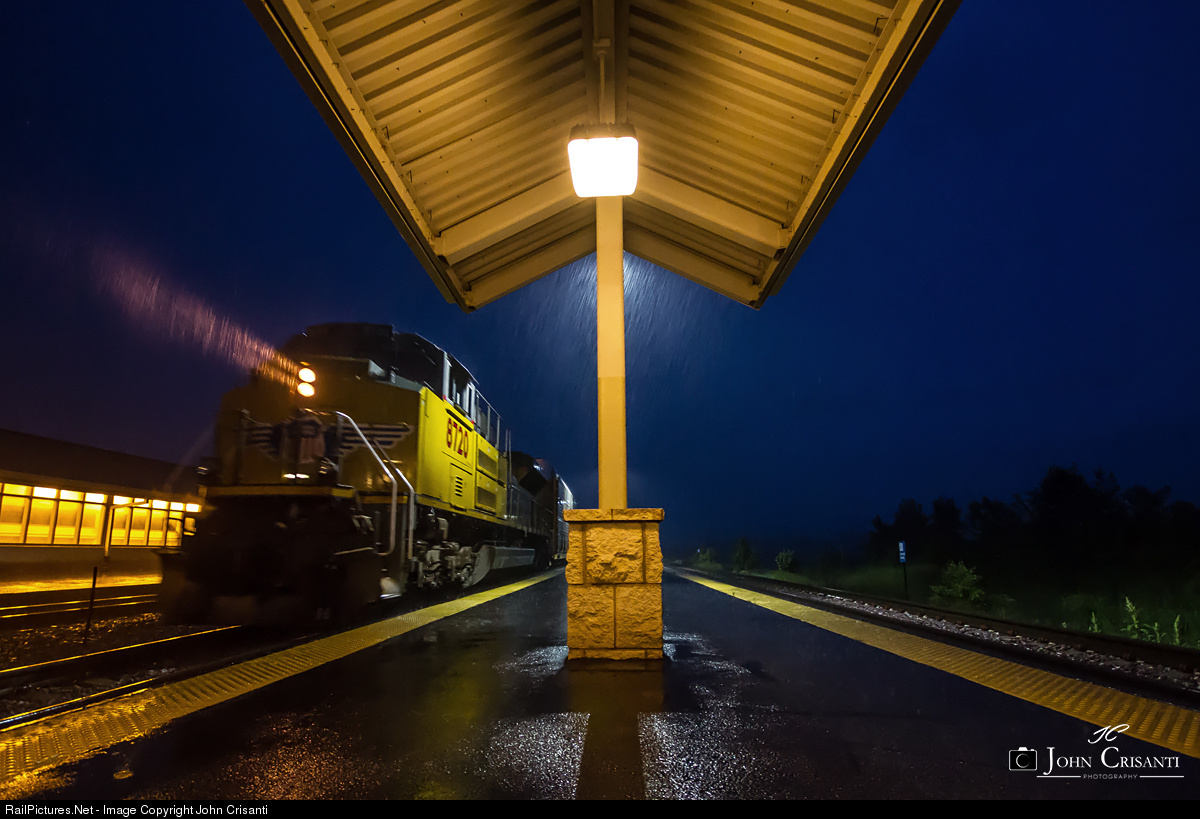 Union Pacific SD70ACe No. 8720 brings up the rear of this Belvidere, Illinois to Blakes Lee Jct., Washington vehicle train as the rain continues to fall at La Fox, Illinois on June 20, 2015 along the Geneva Subdivision.