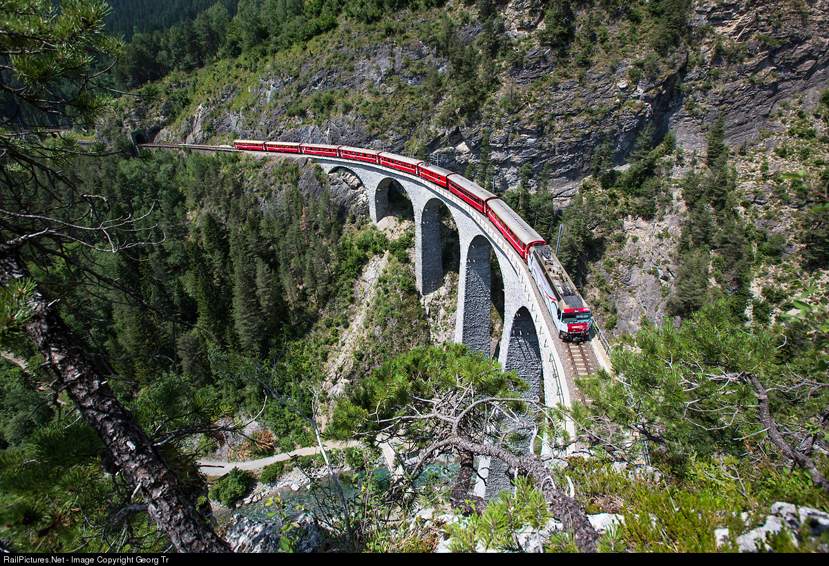 | Ge 4/4 III # 650 of the RhB is wearing a special paint scheme for UNESCO World Heritage Albula Bernina, with a stylized picture of the Landwasser viaduct on the sides. In this proper moment, the locomotive is just pulling RegioExpress 1141 from Chur to St.Moritz over this 65 meter high Landmark of the Albula line. |