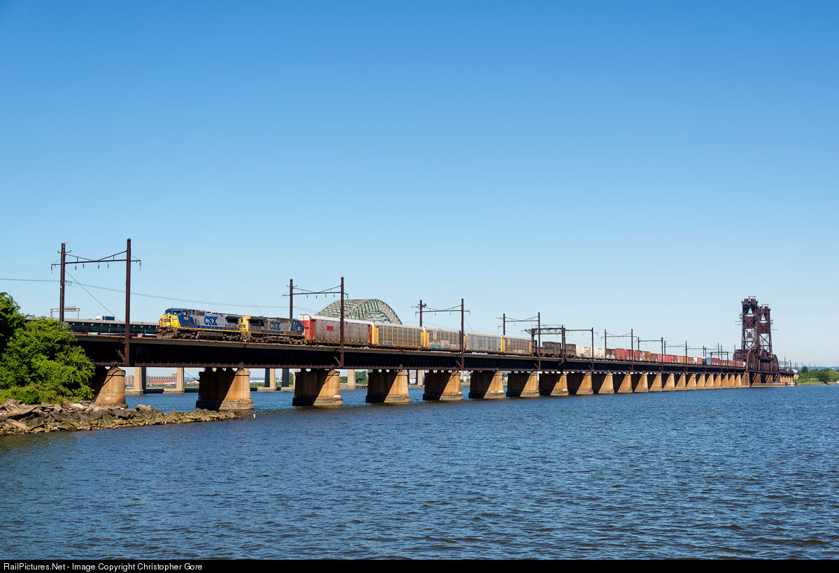 | A CSX mixed freight crosses Newark Bay, on the Upper Bay Bridge, built by the Lehigh Valley in 1930. |