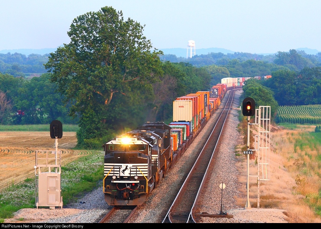 | The NS 233 splits the Elmwood signals lit by the last bit of sunlight of the evening, on it way to the Rickenbacker intermodal terminal on the NS Columbus District. |
