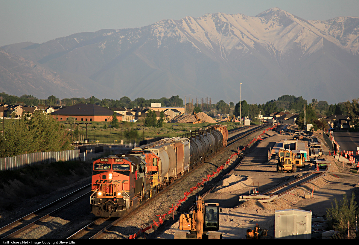 | As strange as this may seem, this is actually a Utah Railway train. The Utah Railway crew is taking one of BNSF's ES44C4 out for a spin on the Provo to Ogden local. The big GE leads two Utah GP38's 2003 2006. They are rolling past the construction site for UTA's Frontrunner Lehi Station. |