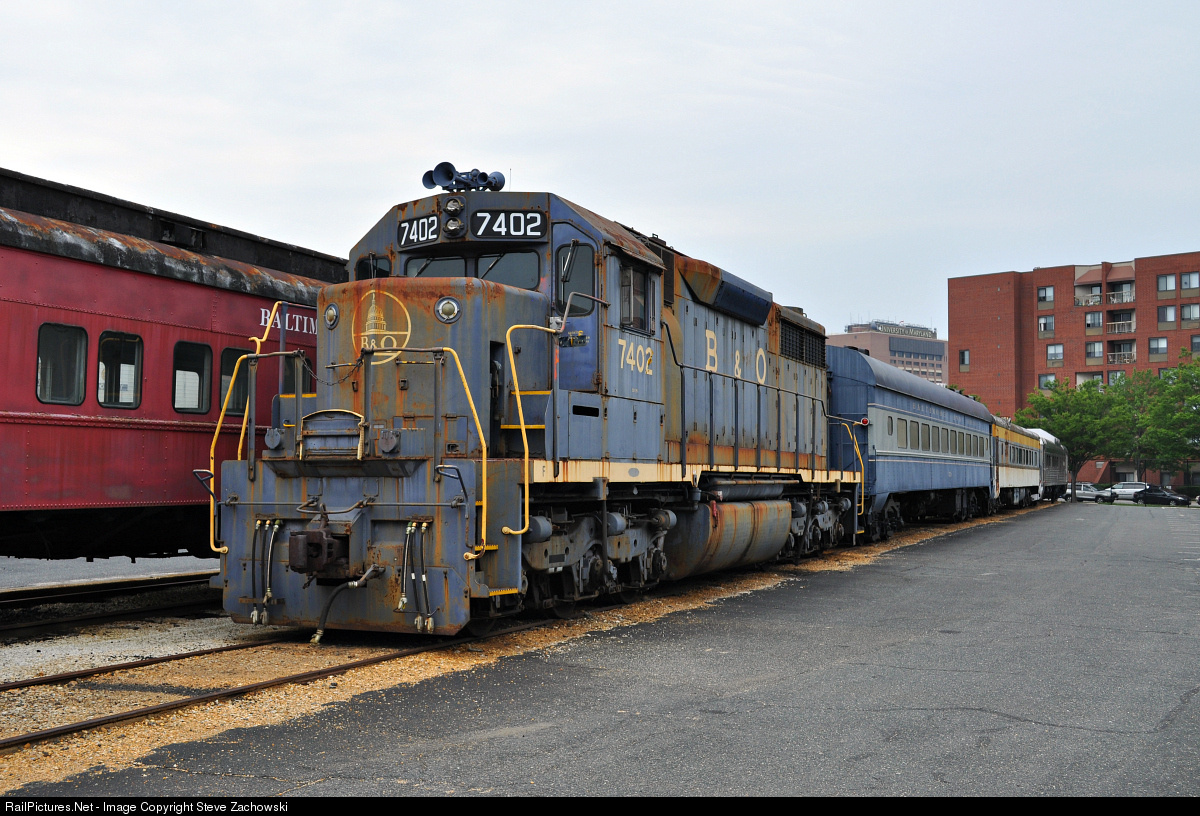 The Baltimore & Ohio Railroad museum in Baltimore, MD has quite an array of equipment displayed outside the museum for visitors to see. In this photo a B&O SD35 is staged on the point of three passenger cars including an RDC on the rear.