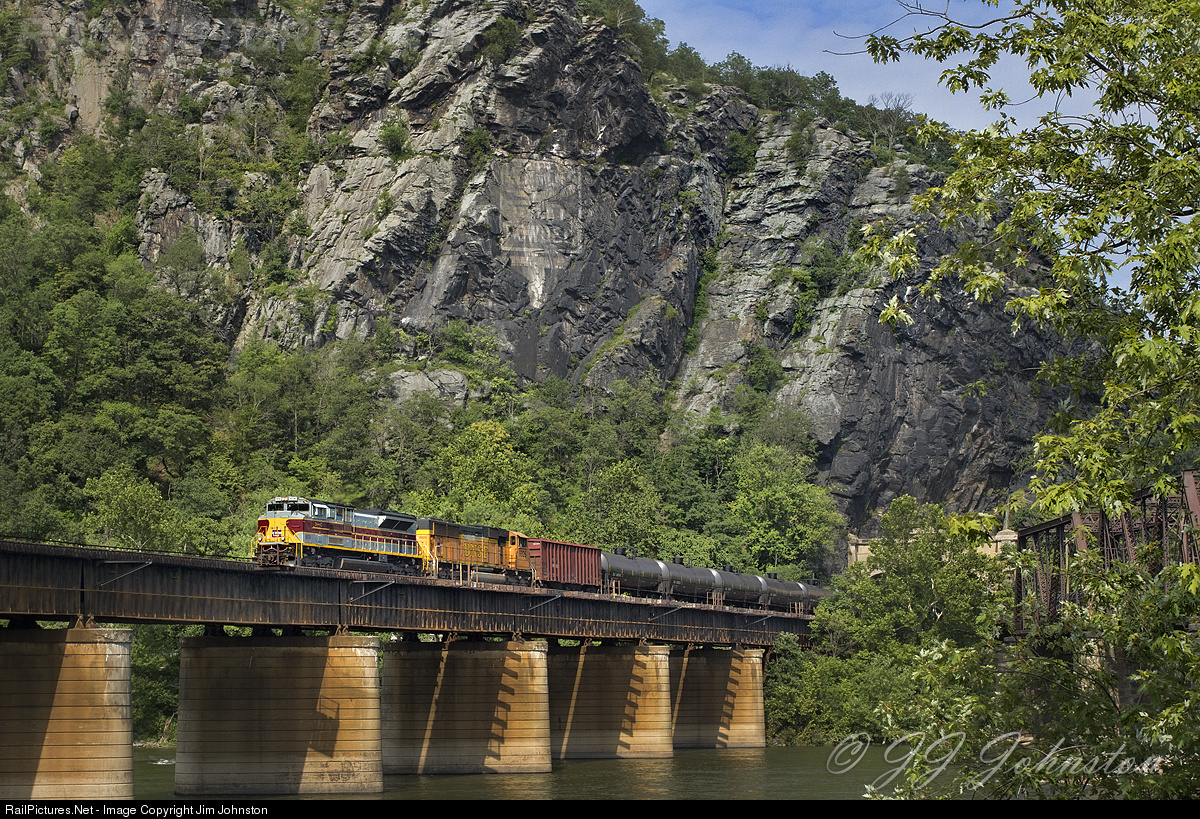| The NS 1074 Lackawanna heritage unit leads an empty oil train out of the tunnel west across the former B&O past historic Harpers Ferry, West Virginia on a beautiful Summer afternoon. |