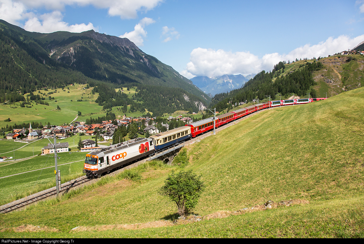 Ge 4/4 III # 641 with Coop publicity paint scheme is pulling 13 car RegioExpress 1132 from St.Moritz to Chur, with 6 GLACIER EXPRESS cars in the rear of the train, and a saloon car from the As 1141-1144 series behind the locomotive. In the background Bergün an on the mountain terrace Latsch.