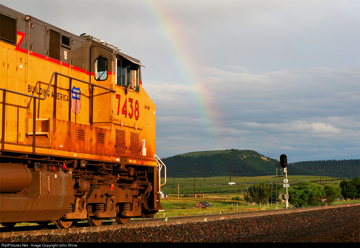 Holding at the Intermediate signal on Main #1, milepost 45.9 at Greenland, a rain shower has just passed as a rainbow appears in front of the UP 7438 heading South.