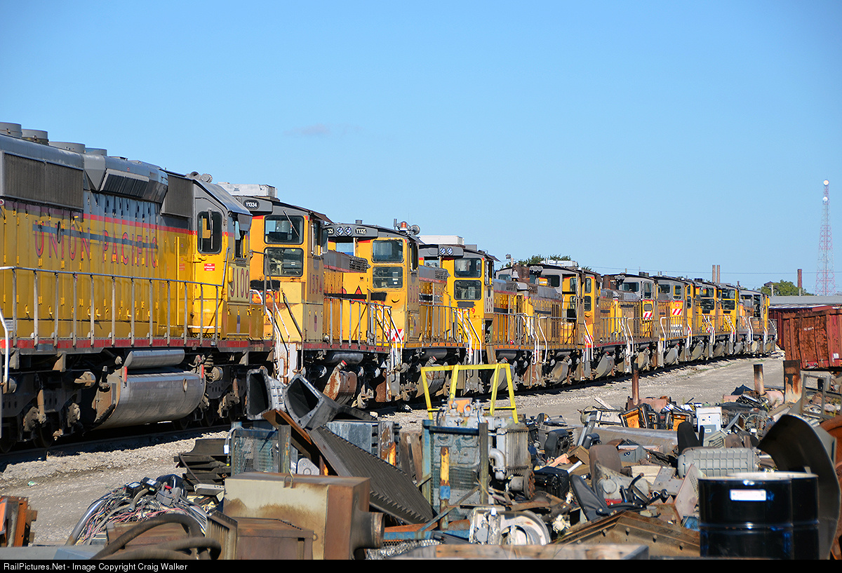 Found at Metro East Industries, Incorporated, in Alorton, Illinois, is a long string of former Union Pacific diesels. There are at least 13 locomotives in this string, primarily MP15DCs.
