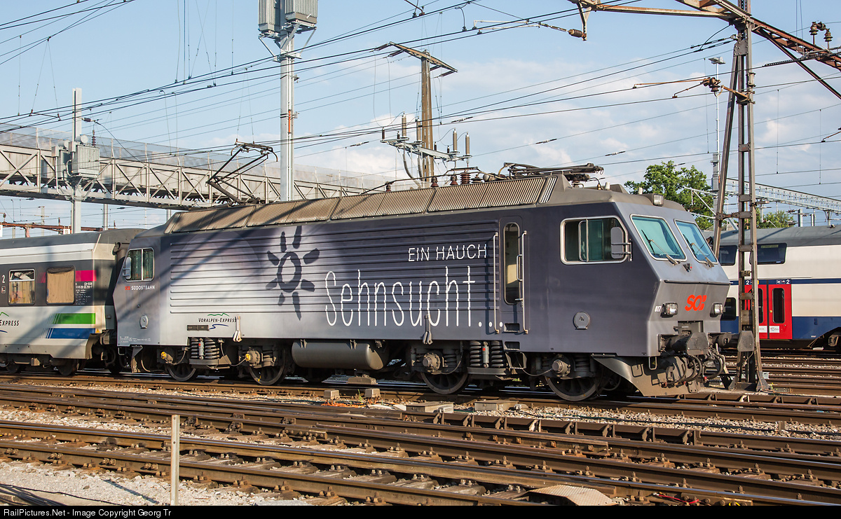 Re 446 017 of the Südostbahn with a new paint scheme "Ein Hauch Sehnsucht" (a breeze of yearning) in Rapperswil. The locomotive was built in 1982 as Re 4/4 IV # 10103 for the SBB and came to the Südostbahn in 1994.
