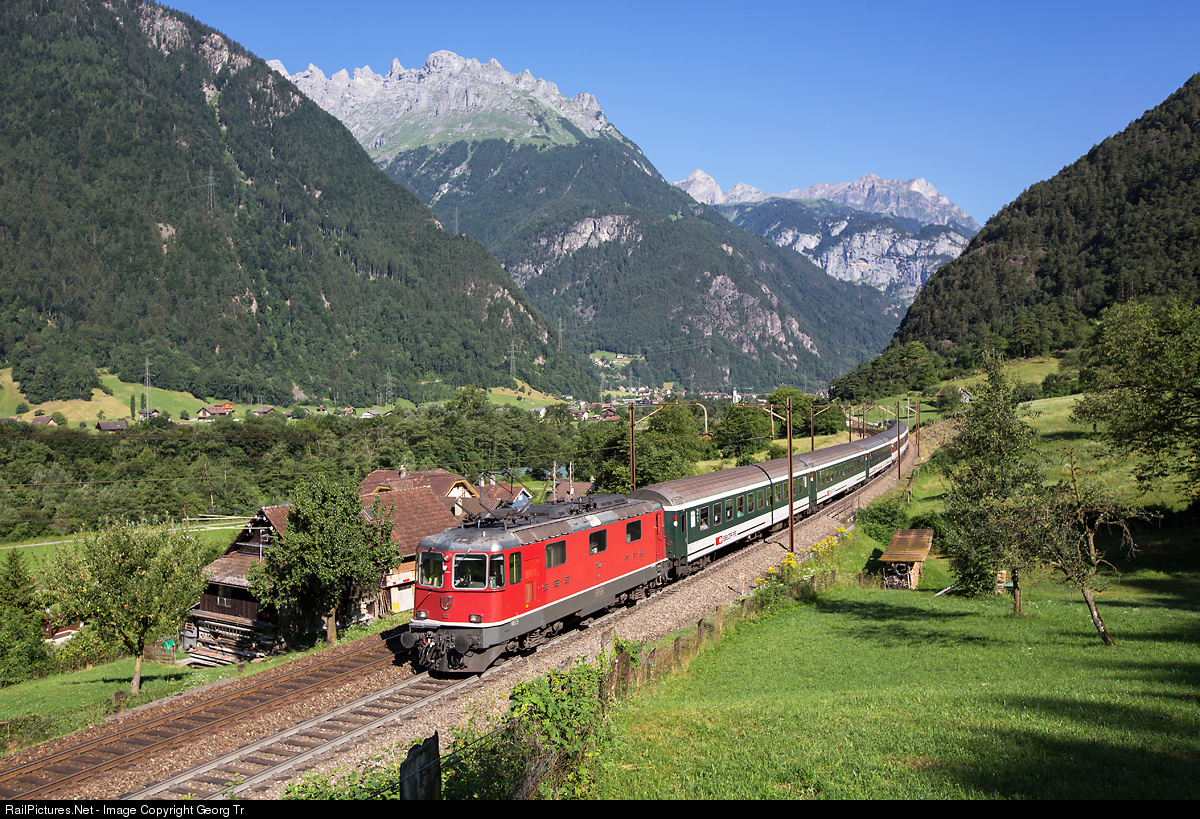 | The classic Gotthard Interregio, pulled by a Re 4/4 II of the first series with scissors pantograph. # 11127 with IR 2313 Basel-Lucerne-Locarno, reinforced by a third green/grey car of the B 50 85 21-73 series (two are regular) from the 1970'. |