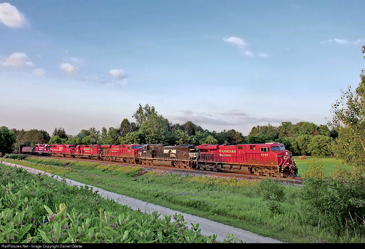 CP 420 rips through Palgrave sporting a large six unit lashup, including CP 8848, NS 9814, CP 8723, 5792, SOO 6061 and CP 3085. The NS unit provided a harsh imbalance in this sea of red, however I'm not complaining. The SOO was by far the talking point of this lashup, as it is the last SOO SD60 in original paint. Standing in weeds about four and a half feet tall, I'm glad I brought my bug repellent. CP 247 was waiting in the siding behind the camera while 420 passed, and it got underway shortly afterwards with a short string of autoracks.