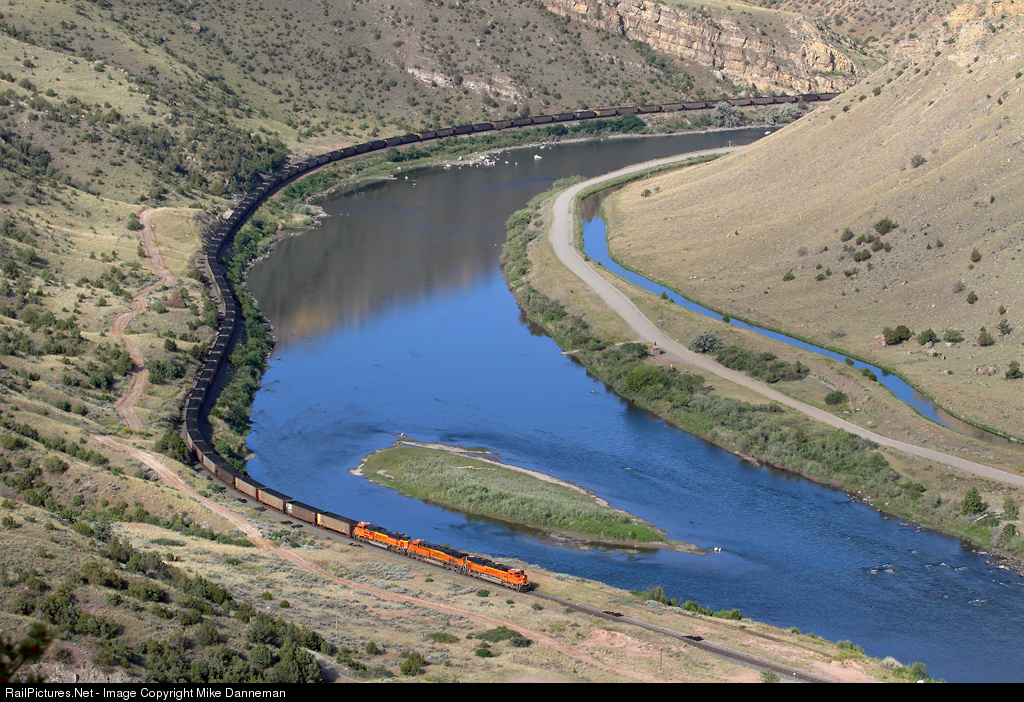 | Rumbling along the Missouri River, a westbound BNSF coal train passes through Lombard Canyon just east of Toston, Montana, on June 25, 2015. |