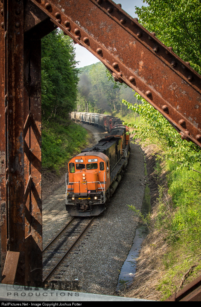 | In preparation of a 10 MPH slow order, Engineer Mike Matson throttles his train down as he crests Keating Summit. The slow order is permanently in place due to a 2% downward grade between Keating Summit and Emporium, Pa. Framing the train is an old bridge that once carried automobile traffic over the rail line, but has been closed for a number of years. |