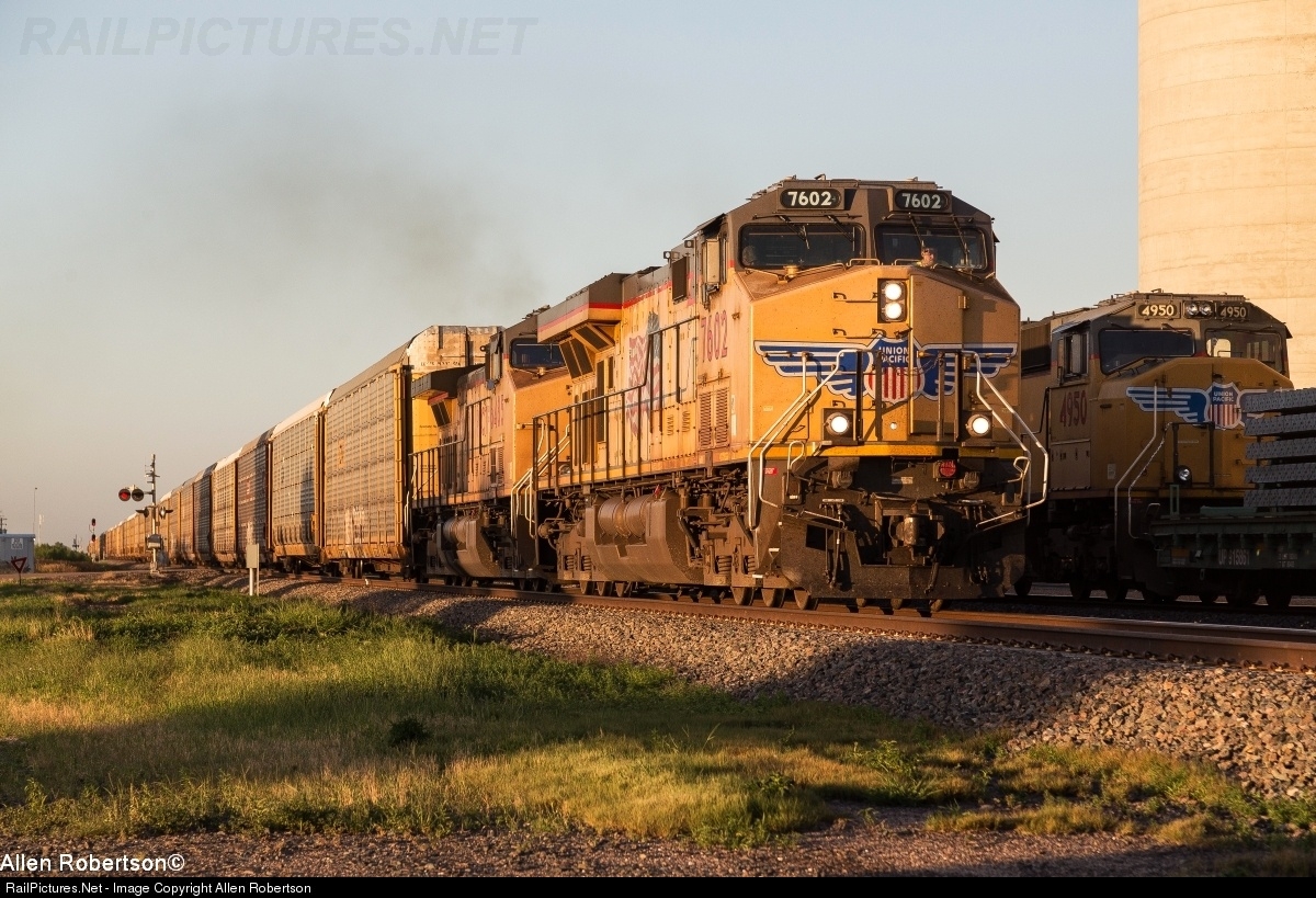 UP 7602 & 6485 lead westbound auto racks past a tie train parked on main two.