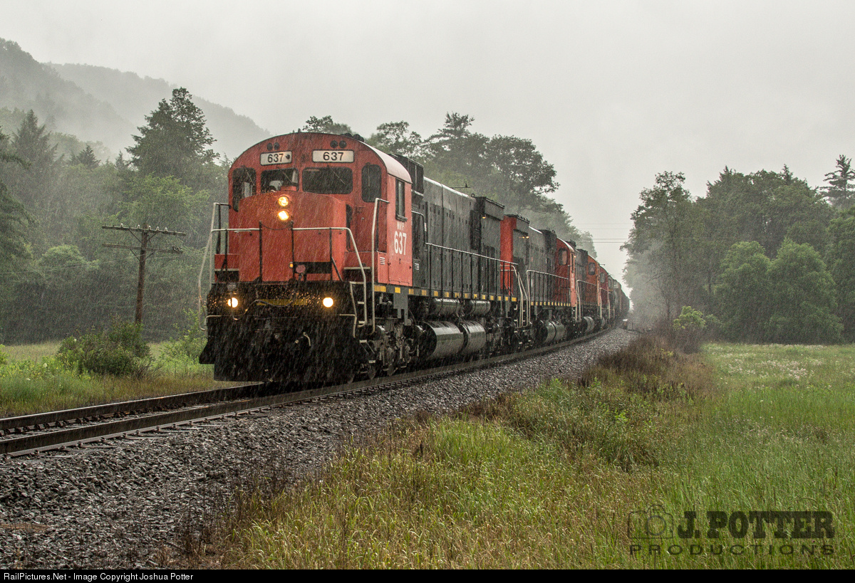 After negotiating the 2.2% downward grade from Keating Summit, Pa., WNY&P 637 leads four other ALCo's through Sizersville, Pa. in a rainfall of biblical proportions.