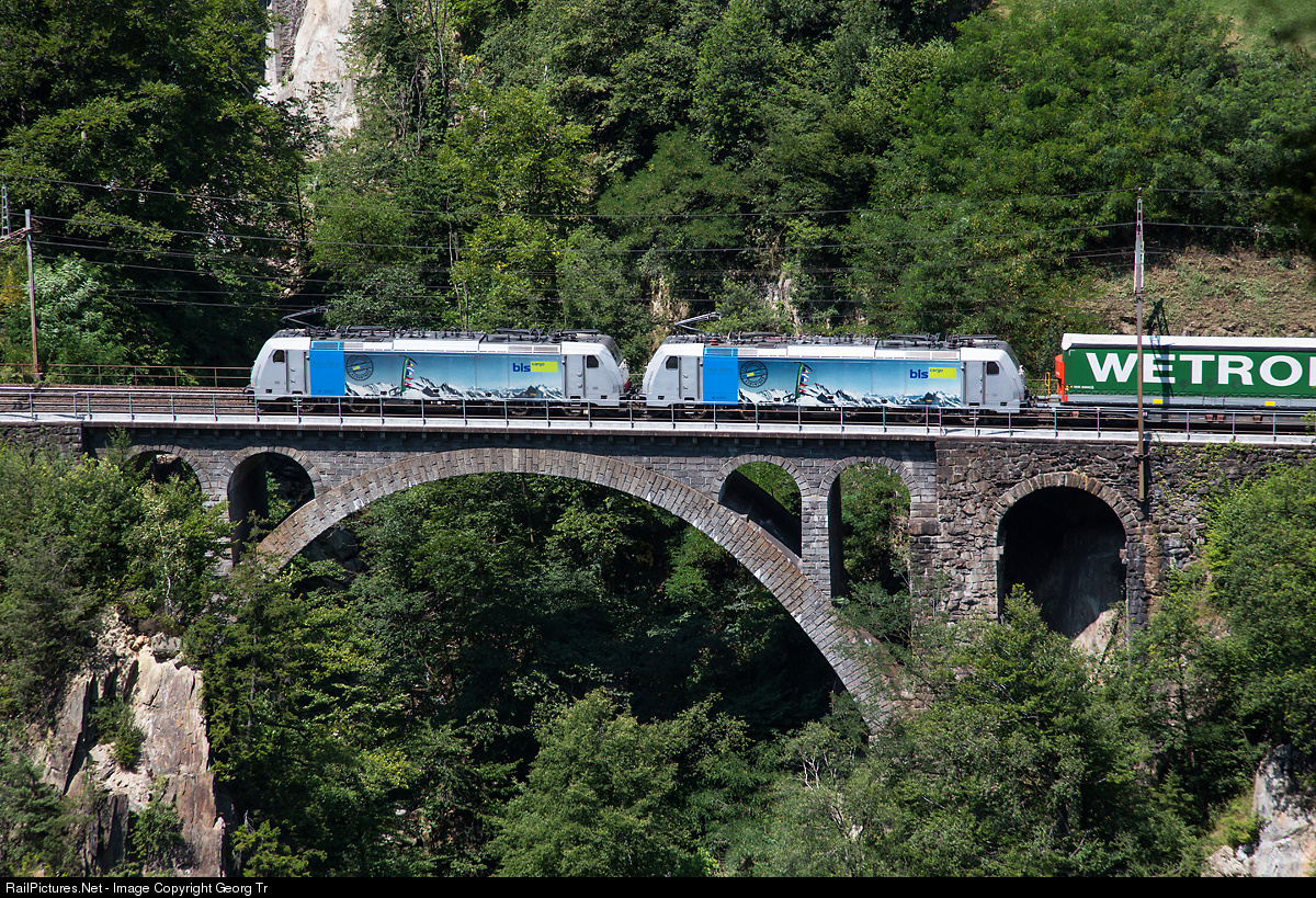 Bombardier TRAXX "F140 MS" 186 101 and 104 of Railpool, rented to and decorated for BLS Cargo, with train 41031 from Venlo to Melzo Scalo, crossing the 40 meter long Intschialpbach bridge on the Gotthard north ramp.