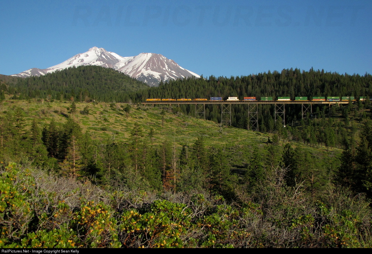 A shot on the bridge, or with the mountain... Why not both? A long hike out through the manzanita yielded this view looking back broadside at Dry Canyon Trestle with the 14,179-foot-high summit of Mount Shasta behind. The second of three northbounds that evening, the daily LA to Brooklyn Z train, cruises north over the trestle under a crystal clear June sky.