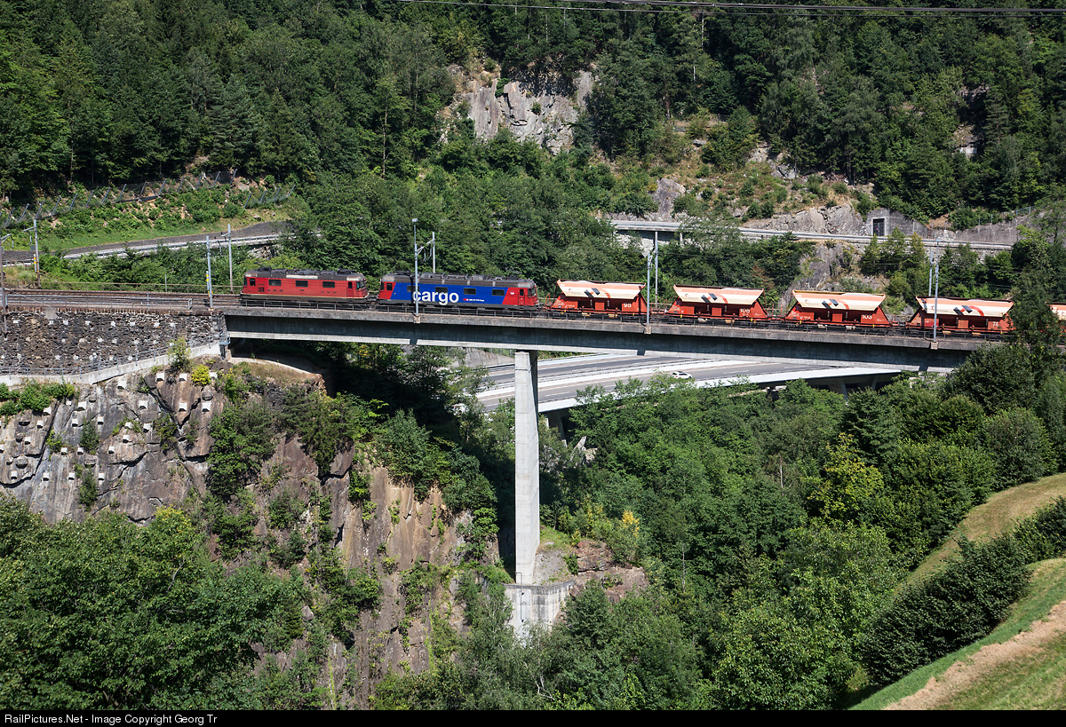 | Re 4/4 II # 11236 and Re 620 (Re 6/6) # 033 in multiple (also called "Re 10/10") with the gravel train from Hüntwangen to Sigirino, crossing the 77 meter high Intschireuss (or Intschi gorge) bridge on the Gotthard north ramp. |