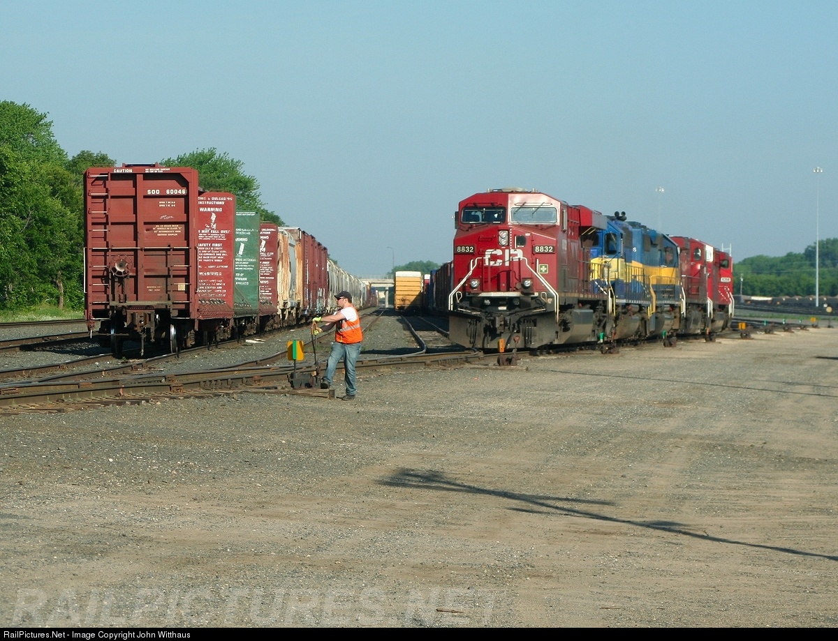 | On a hot summer morning, the conductor on H26 lines the 7 unit lashup down the lead at Humbolt. They will be taking 115 cars down the hill to St. Paul, then they'll take light power to the Koch refinery at Rosemont to bring a loaded coke train back to St. Paul. Looks like a full day of activities for this crew. Taken while off duty, wearing full PPE. |