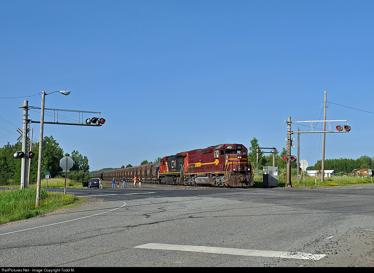 | When DMIR 403 leads a train the foam usually comes out of the woodwork to document the occasion. Here is DMIR 403, the last maroon Missabe tunnel motor on the vast CN roster, leading a T-Bird crude ore train along the Missabe Subdivision crossing Highway 7 near Eveleth, MN in route to the Fairlane plant a few miles further down the line. |
