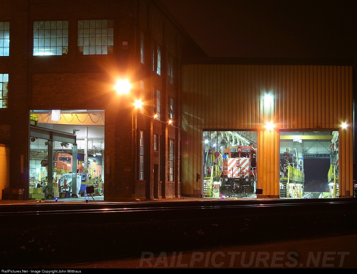 | No fireworks for the maintenance crews at the diesel shop at St. Paul, their work must go on to keep the locomotives running. Here a couple of engines are serviced, including a BNSF SD70MAC and a CP SD40-2 that belongs to one of the hump sets. Taken while off duty, wearing full PPE. |