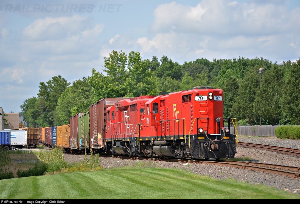 | Raritan Central RC02 is pulling empties off of the Northfield Industrial track with GP20 #701 which has been freshly repainted and ex B&O GP30M #5, their latest purchase. |