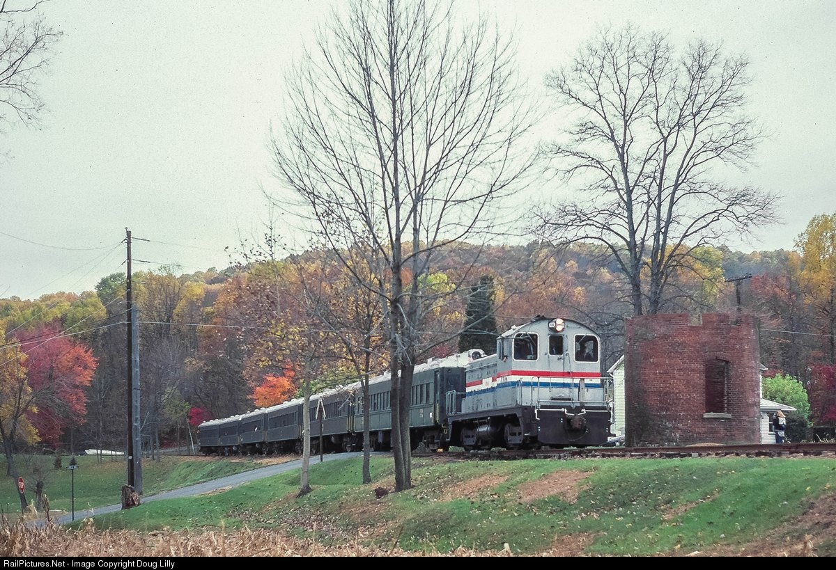 The Reading's Perkiomen Branch, which diverted from the main line at Perkiomen Junction, near Valley Forge, rejoined the East Penn branch at Emmaus Junction, providing a short cut between Philadelphia and Allentown that bypassed Reading. In the 1970's, the line was removed between Red Hill and Oaks, leaving two stub-end branches to be served from either end. In the 1980's, the northern end between Red Hill and Emmaus Junction was spun off by Conrail, initially operated by the Anthracite Railway. This is one of a series of excursions with an ex-Amtrak SW1 for power, shown passing the one-time Reading water tank base at Powder Valley.