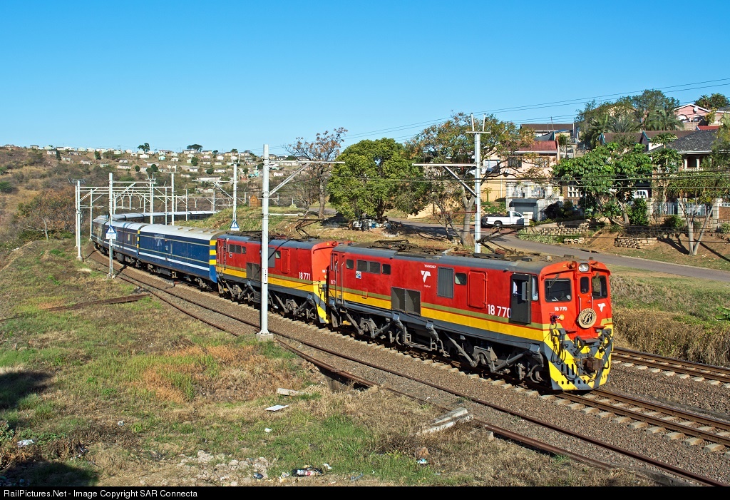 | The luxury Blue Train, headed by 18-770 / 18-771, passes through Shallcross. The train was running contra flow at this stage due to line occupation for maintenance and is on its way back to Johannesburg / Pretoria, having been on a special charter to Durban for a couple of days. |