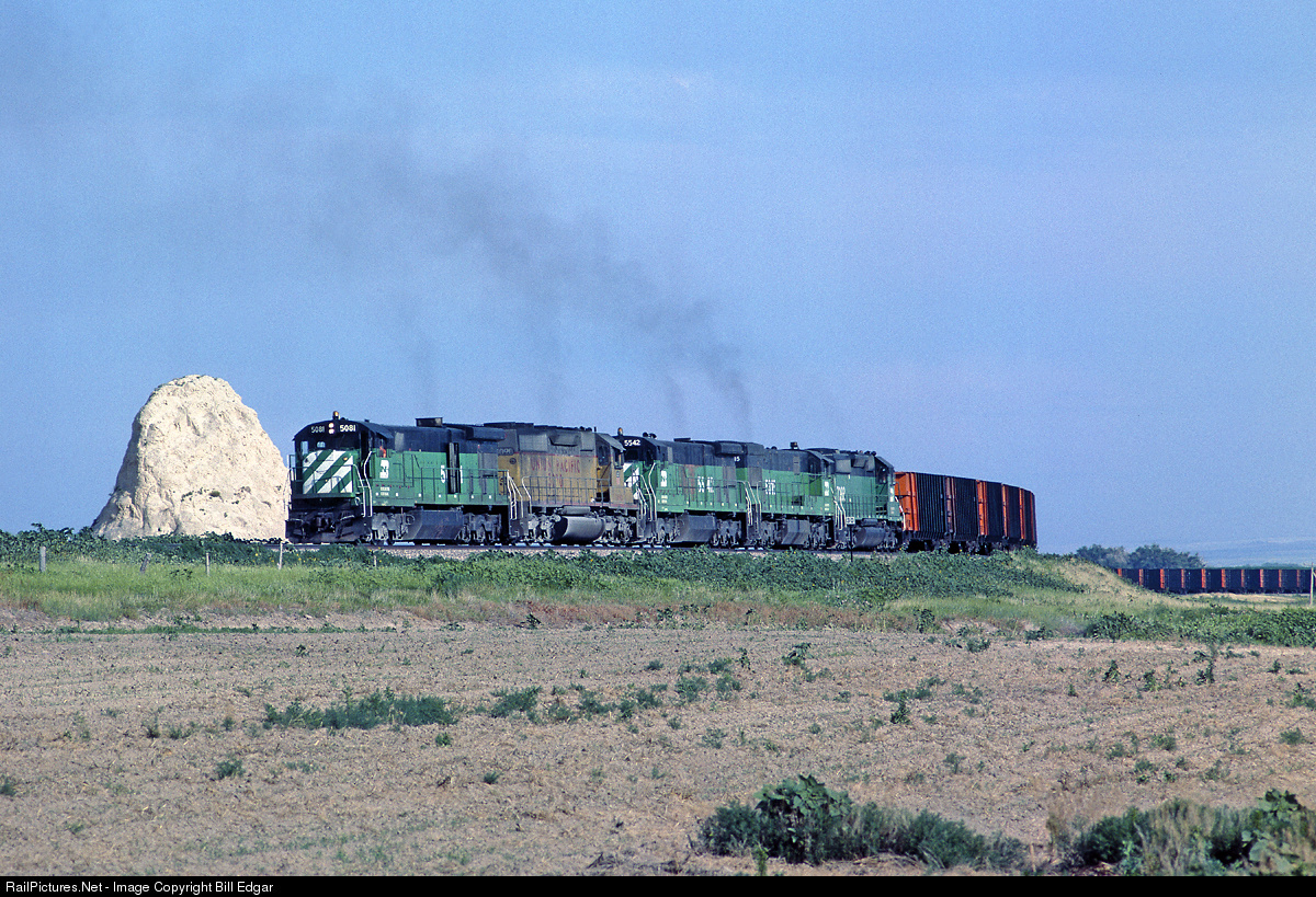 A BN empty coal train climbs the Angora hill grade out of Northport, NE en route to Alliance and the Powder River Basin of Wyoming. The train features 2 C30-7s, a UP SD40, a BN U30C and BN SD40-2.