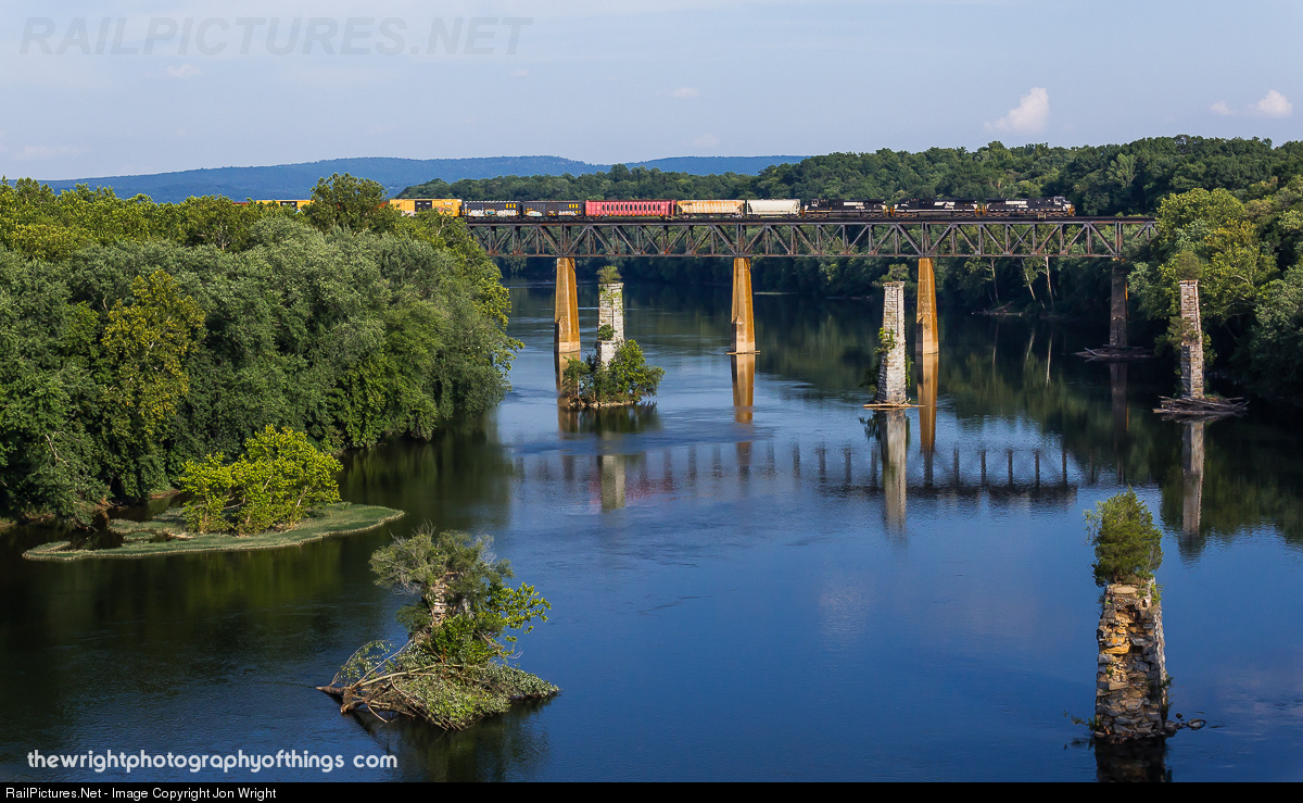 Of the many bridges that span the Potomac River here, only 2 are active. In the foreground are the remains of a prior road bridge that connected Maryland on the left and West Virginia on the right. The higher further piers are what remains of the old Shenandoah Valley Railroad bridge that stood until 1917. Finally, the present and former Norfolk and Western railroad bridge that Norfolk Southern train 13R is seen high above the water. Another bridge stood in the immediate foreground but was totally demolished upon completion of the current road bridge which the photographer is on. For this and other photos please visit my site at thewrightphotographyofthings.com