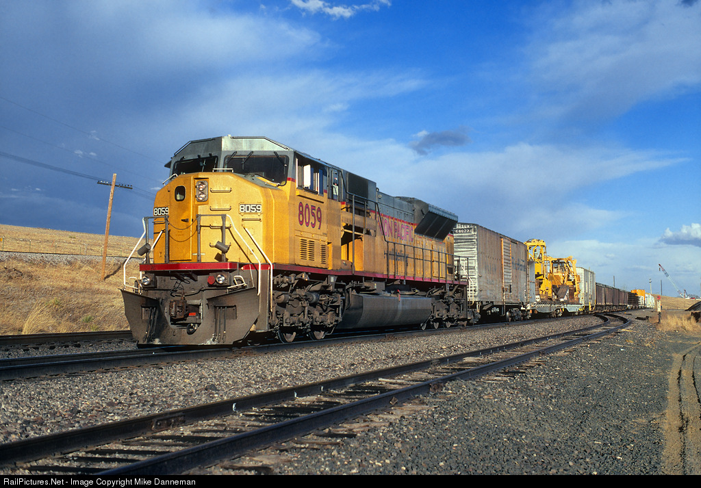 Union Pacific EMD SD9043MAC No. 8059 leads a wreck train westbound at Rocky, Colorado, on March 5, 2000. From what I remember, the train was dispatched to a derailment at remote Azure on the west side of Gore Canyon on UP’s Moffat Tunnel Subdivision. Two sideboom caterpillar bulldozers, with support 40-foot boxcars are behind the power, followed by five cars of ballast and five cars of track panels. Much of this 20-car train is former Rio Grande equipment used in the Denver-based wreck train.