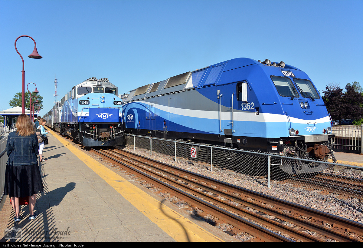 As the AMT #40, with AMT 1352 (Bombardier ALP-45DP) leading, waits for departure on north track, AMT #20, with AMT 1348 (EMD F59PH-3) leading, is about to stop at the Beaconsfield station to pick up the passengers. AMT 1348 is now in service after being repainted and rebuilt in Brookville, PA.