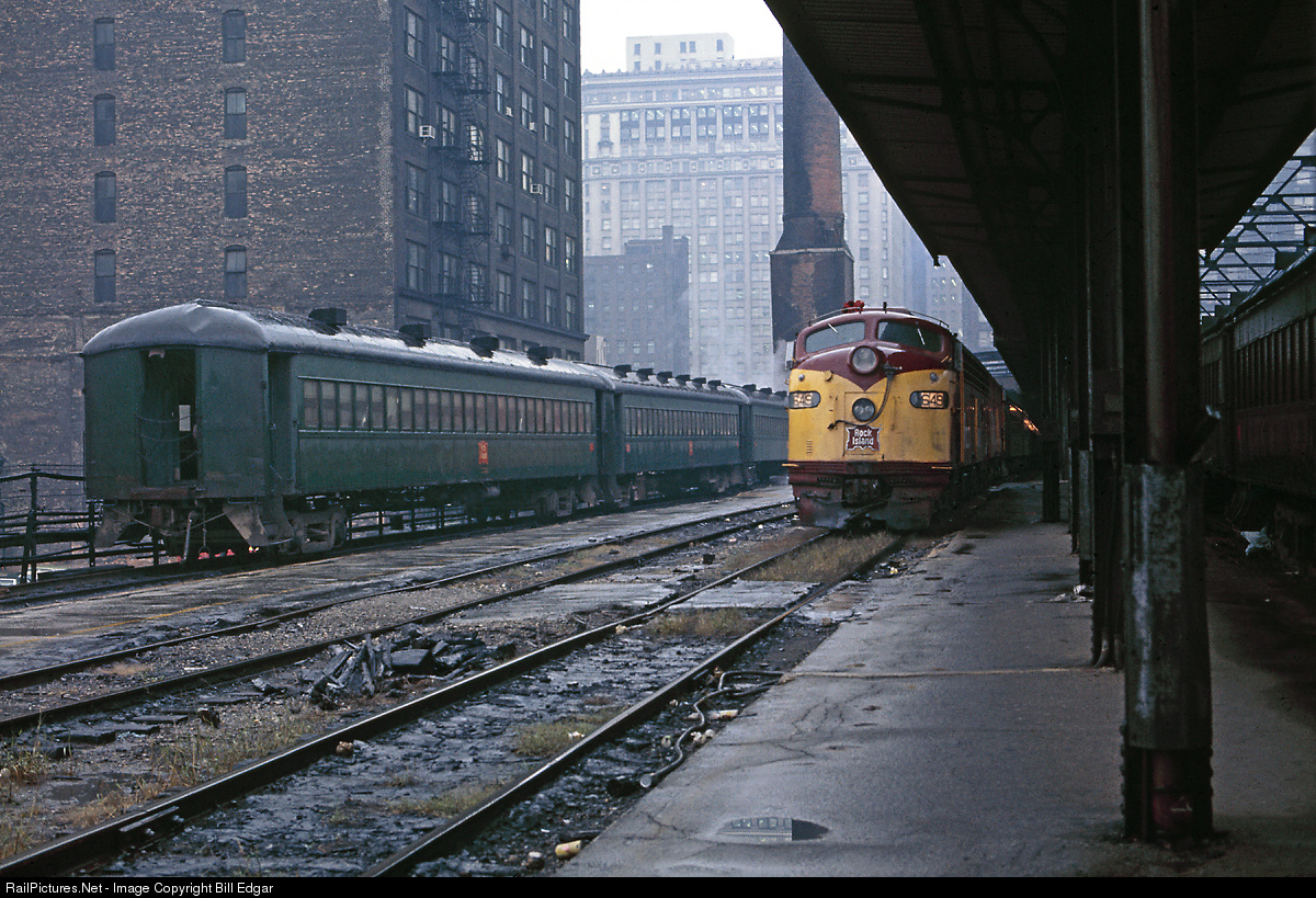 A cold, wet, gloomy November day greets the Rock Island and its commuters at La Salle Street Station, Chicago as E8 649 and another E wait for their next assignment. In addition to running commuter trains, Rock Island had not joined Amtrak and was required to run a Peoria and Quad Cities Rocket pair daily. The gloom pretty well predicts the outlook for this Midwestern granger road.