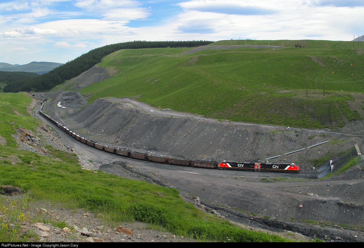Two New Canadian National Railroad AC locomotives pull the 2.7-3% grade into Luscar, Alberta. The green fields are areas of reclamation from earlier mining activity. Teck's Cardinal River mine currently uses the load-out at Luscar via a long haul road. The processing plant cleans and sizes coal for the steel industry around the world.