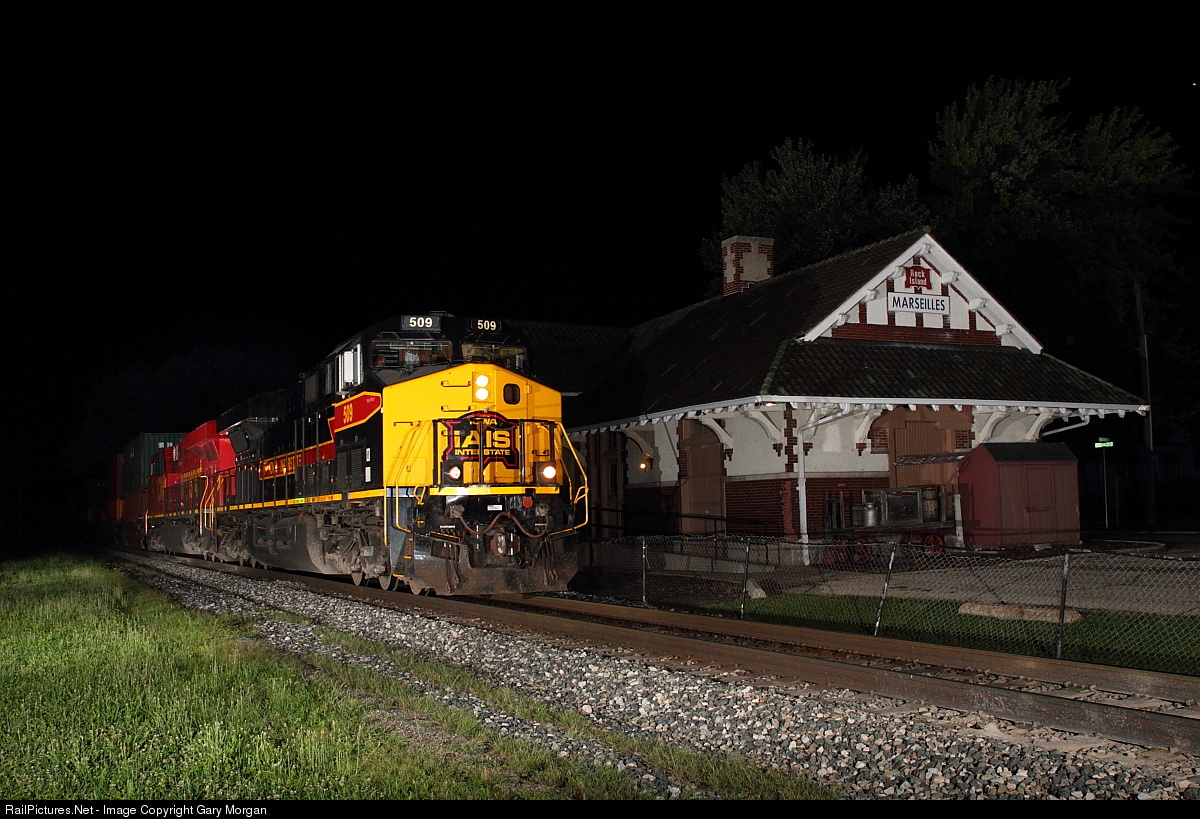 | I set out to do some night shooting knowing that both Iowa Interstate train's had good power leading. This one here had the IAIS 516 leading but while heading across the Blue Island sub a tree jumped right out in front of it. Causing damage to the handrail on engineer side per FRA the 516 could not lead no more so the IAIS 509 was put on the point. This is the CBBI heading eastbound at Marseilles, IL.7-22-15 |