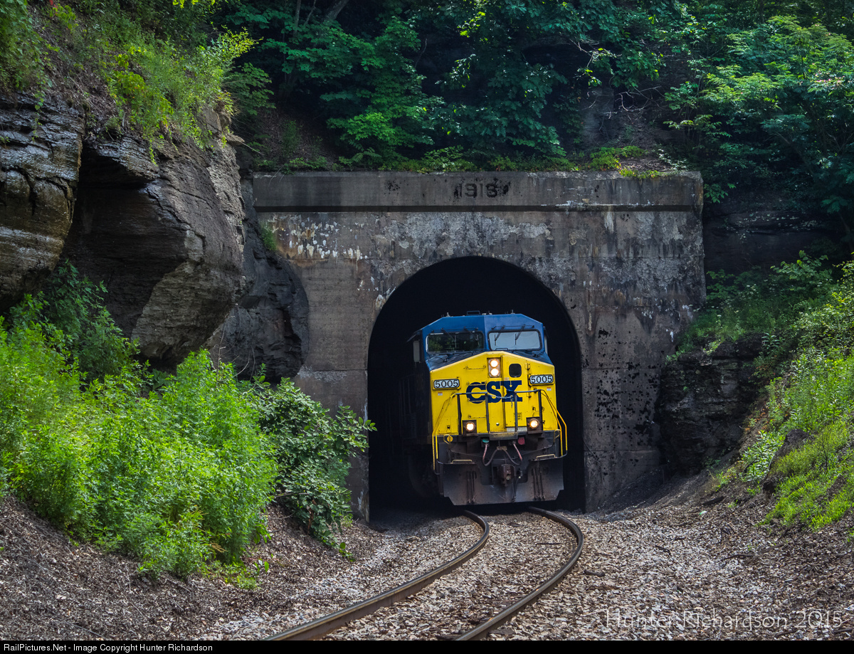 | After holing the main at SE Delano for MoW, southbound grain train G610-20 pops out of a tunnel between Clinchco and Haysi on the CSX Kingsport Sub. This train would continue south to Dante, and continue south to Erwin after cutting off it's pushers. |