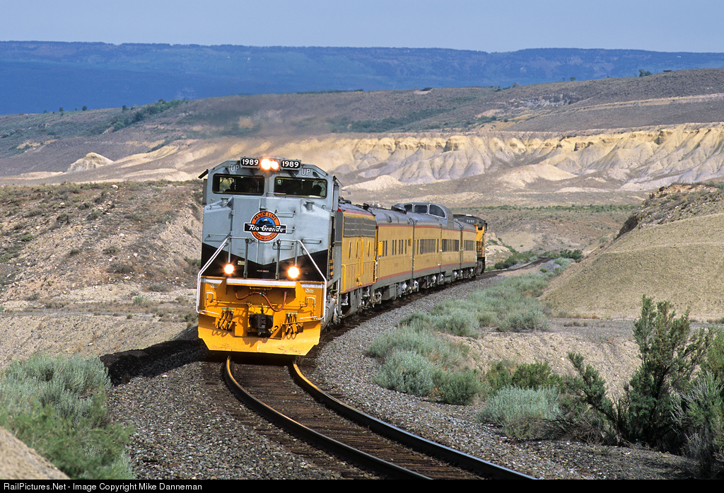 Union Pacific Rio Grande heritage SD70ACe No. 1989 leads an eastbound Operation Lifesaver special east of Payne on Colorado’s North Fork Subdivision on June 14, 2009. Behind 1989 is UP E9B No. 963B, and on the other end is GE AC4400CW No. 7250 used as lead locomotive on westbound trips on the branch.