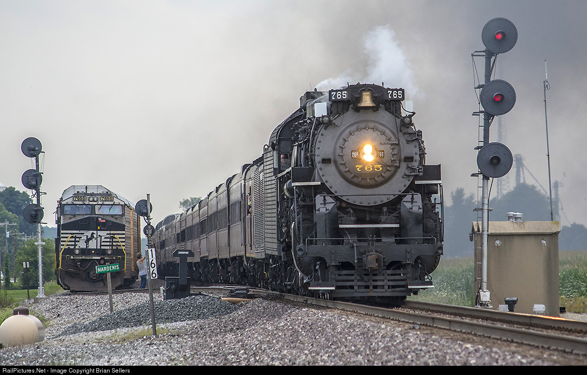 | NKP 765 highballs past NS 7656 at Mardenis, IN. The searchlight signals still govern the control point on this former Wabash line. |