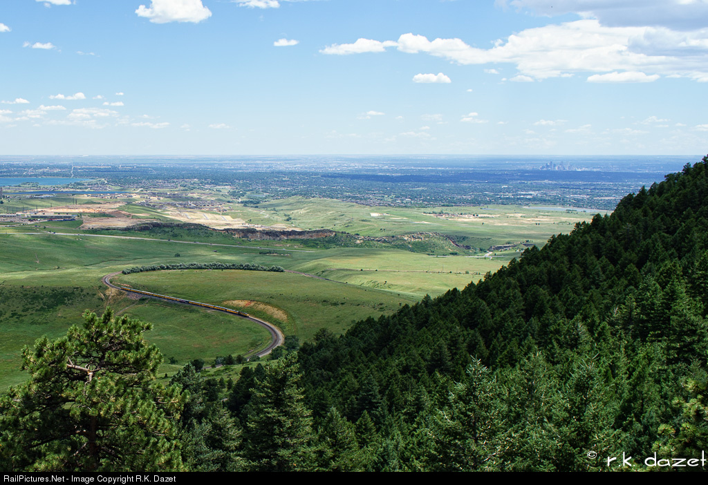 A Union Pacific 10 car special heads through the Big Ten Curves toward Denver. The Denver skyline can be see in the upper right. Maybe the same Officer's Special photographed by James Belmont the day before in Utah?