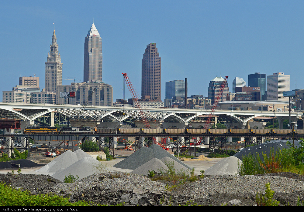 Loaded coal train 552 crosses over the Cuyahoga River valley in Cleveland as the NKP heritage unit leads the train west.