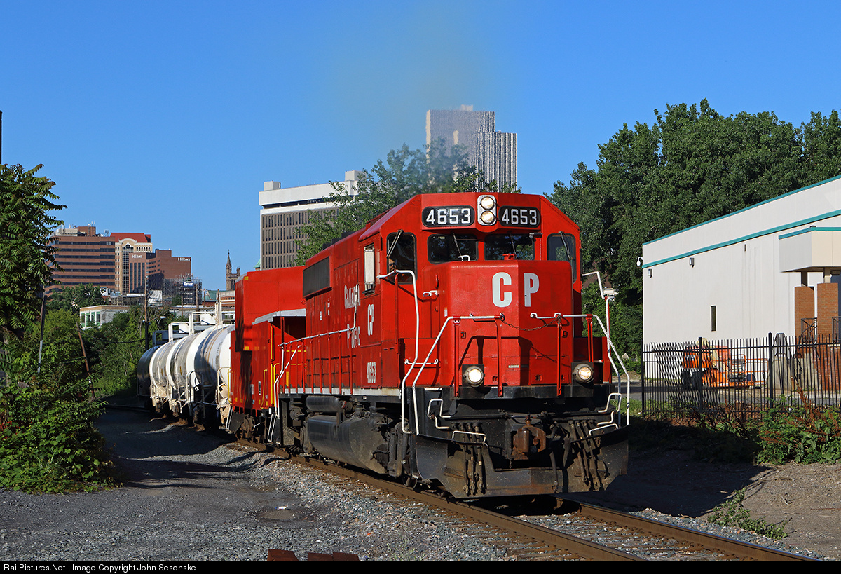 | Canadian Pacific Kenwood Yard based local D10 makes it's way through downtown Albany on its way to deliver some cars to Surpass Chemical on the north side of the city. A former B&M GP40-2 in a paint scheme unique to these units (applied by the shop in Binghamton, NY) leads the train that includes a former CP caboose converted to a shoving platform. |