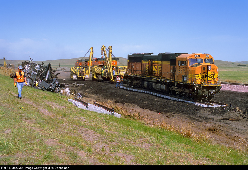Crews from Hulcher and R.J. Corman help BNSF clean up a wreck site at Lakeside, Nebraska, on the Sand Hills Subdivision. The derailment happened on May 17, 2006, when an eastbound BNSF coal train led by No. 8814 ran an intermediate signal with a red aspect and plowed into the rear of another coal load, with obvious results. The trailing locomotive of the train, along with a rear DPU on the train hit, were also damaged, along with seven hoppers that also derailed and were destroyed. Both the trailing GE AC4400CW and GE ES44AC DPU of the other coal load are seen in the background.