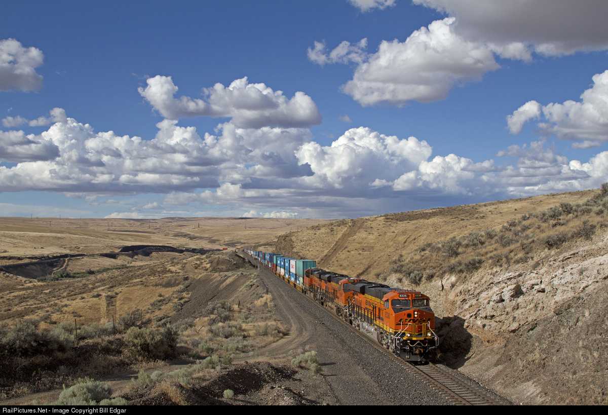 | BNSF 8336 and two mates haul an eastbound stack train up Trinidad Loop as the train climbs out of the Columbia River Basin and heads to Quincy and eventually Spokane. Late afternoon sun played in the clouds, and after missing one sun lit shot, this train cooperated. |